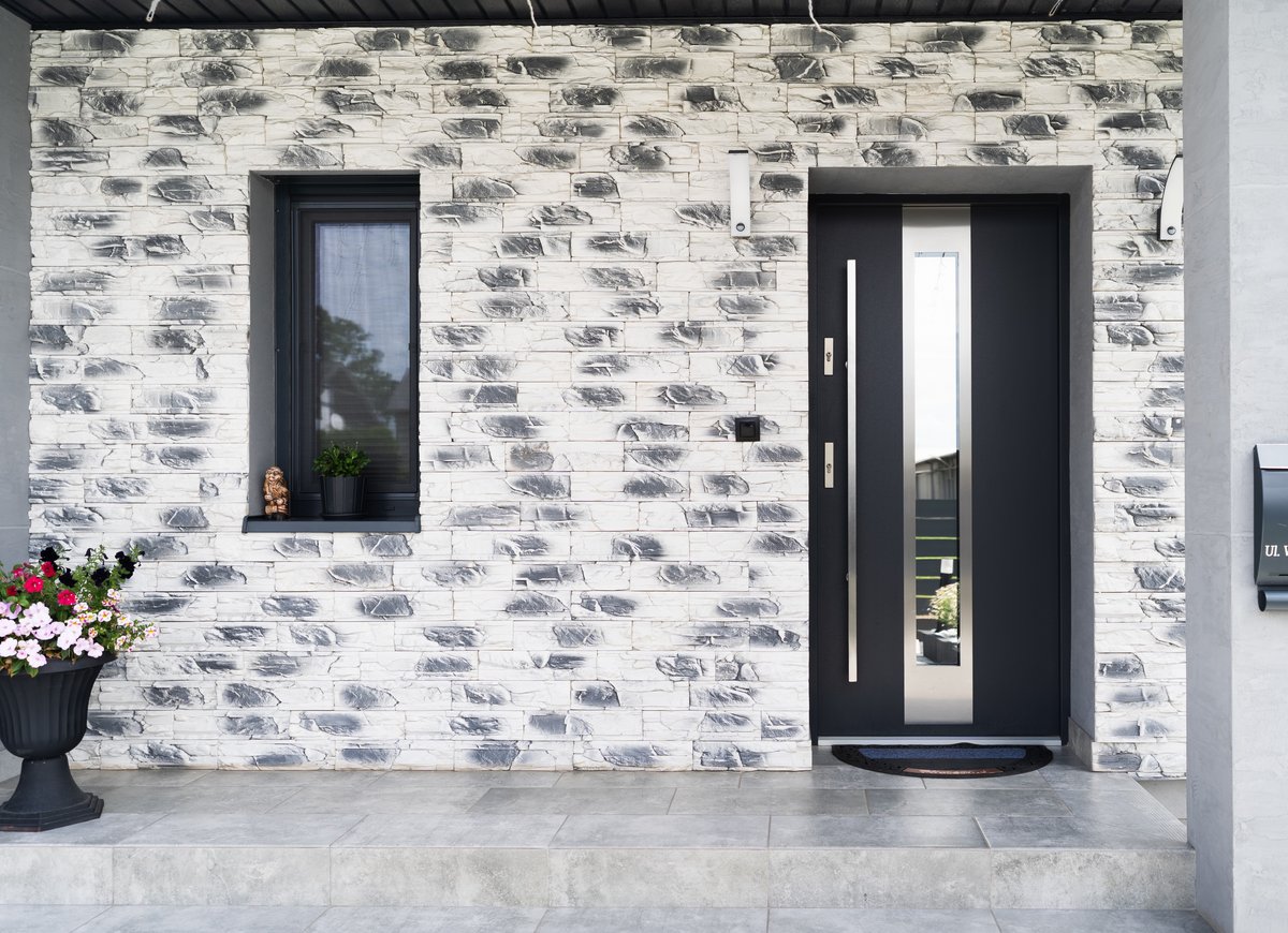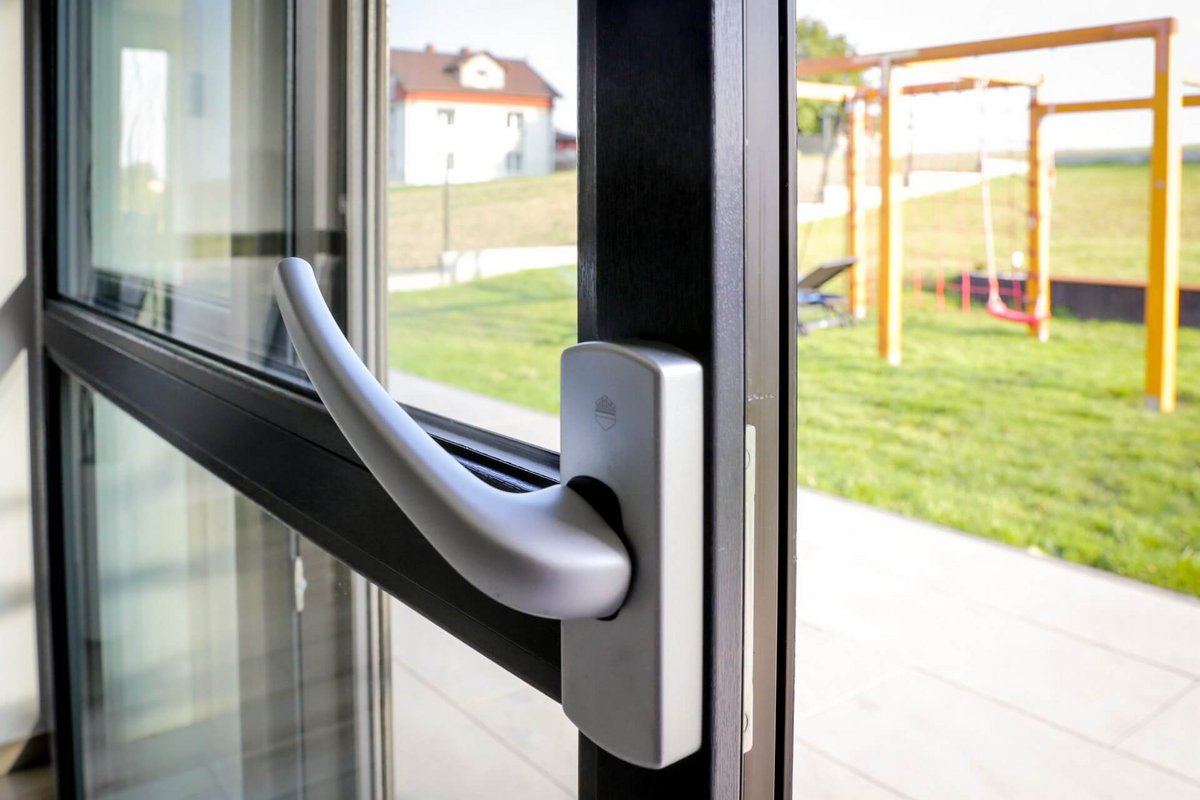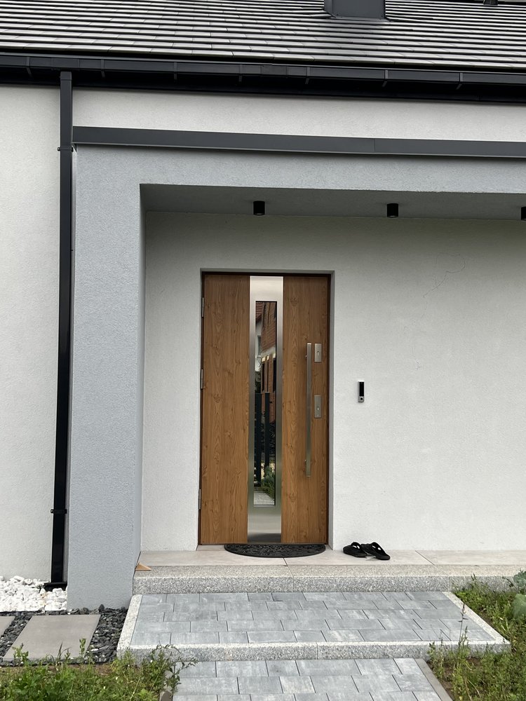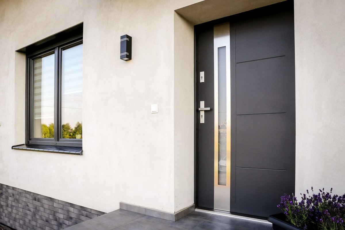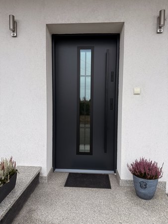 Montaż okien i drzwi zewnętrznych. Okna Drutex, profil IGLO 5 Classic, kolor: antracyt Drzwi KMT, model: 11s3, kolor: antracyt z dodatkami w kolorze inox