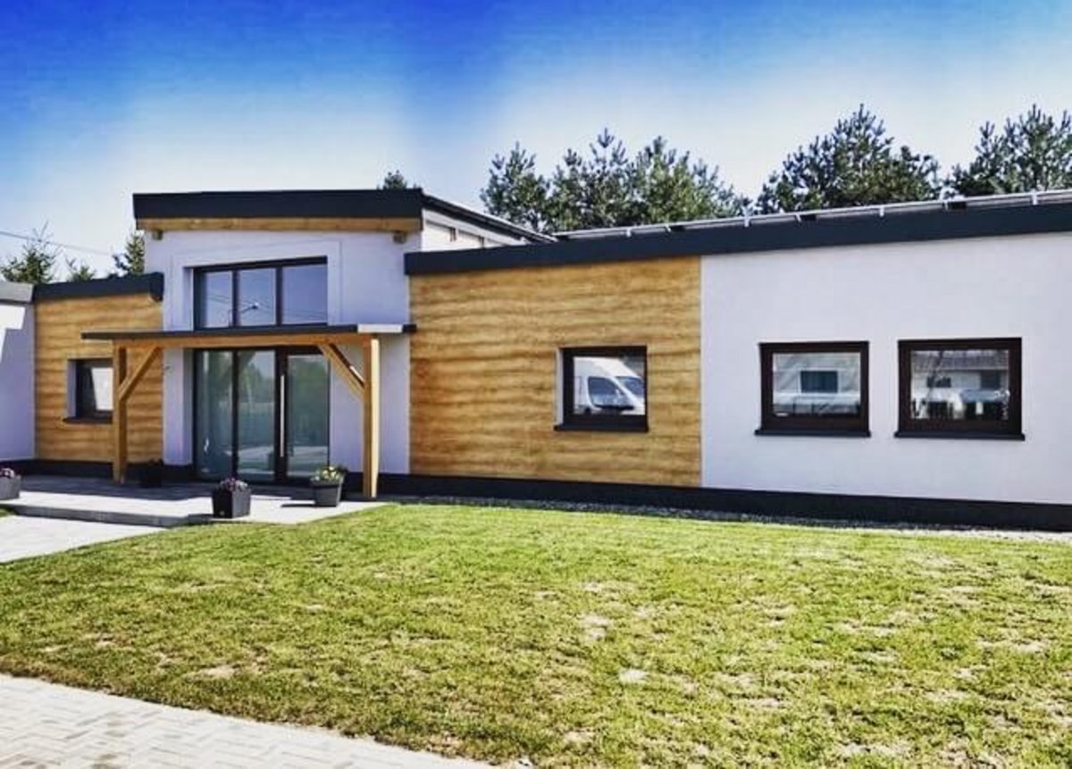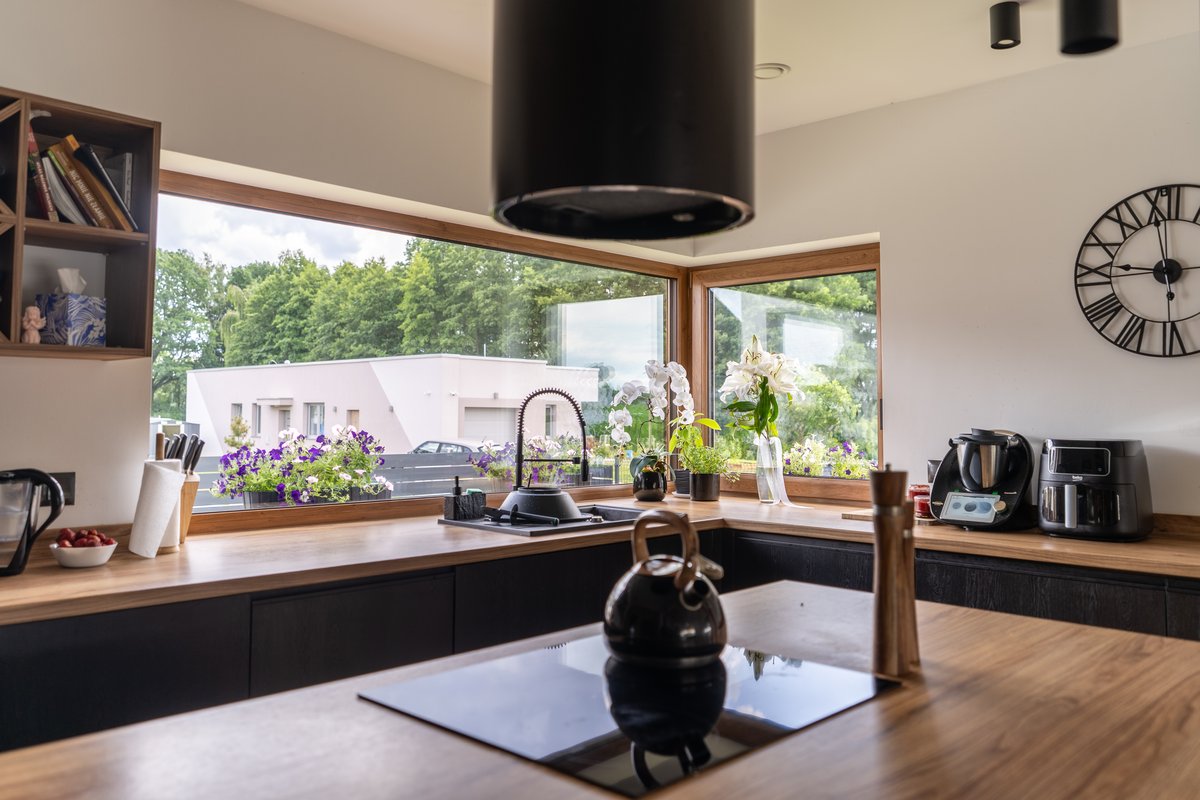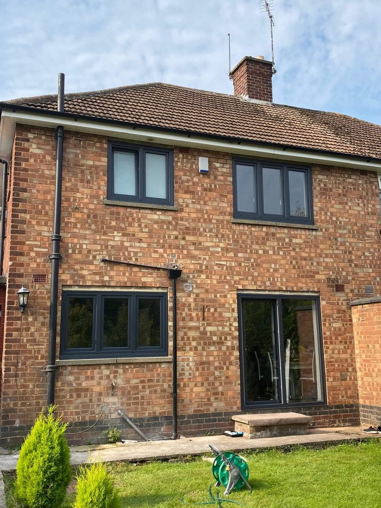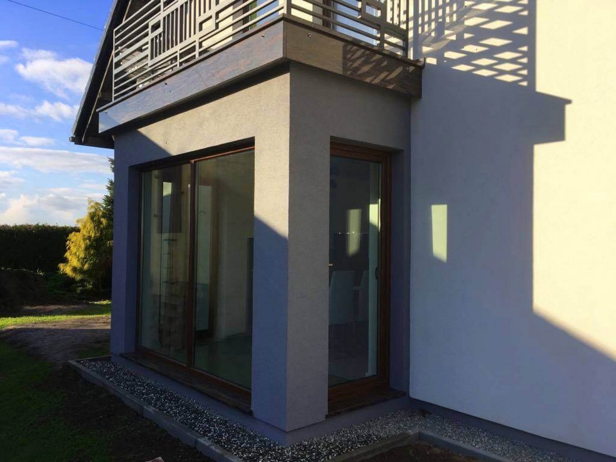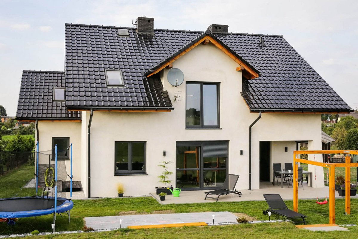 Montaż okien i drzwi zewnętrznych. Okna Drutex, profil IGLO 5 Classic, kolor: antracyt Drzwi KMT, model: 11s3, kolor: antracyt z dodatkami w kolorze inox