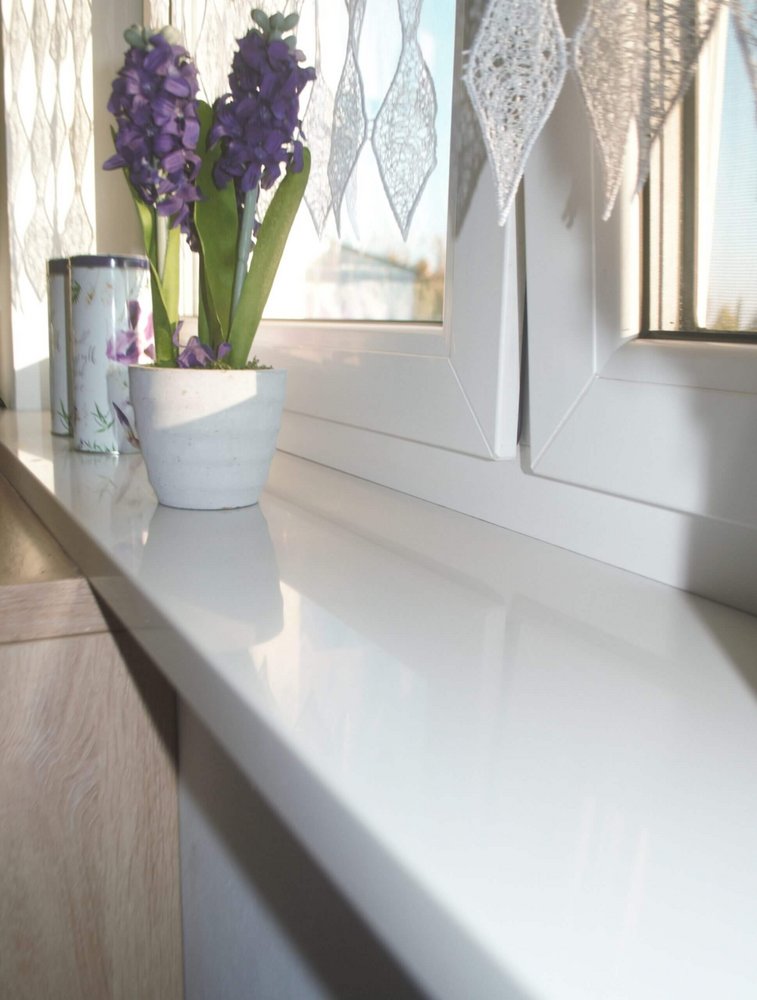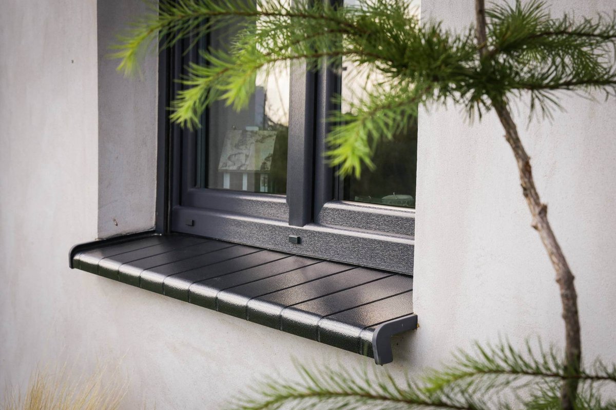 Montaż Okien PVC i Rolet. Okno dwuskrzydłowe IGLO 5 Classic, kolor: Antracyt, Rolety podtynkowe z prowadnicami pod kolor okna, parapet Alu-Płytka kolor: Antracyt Antyczny