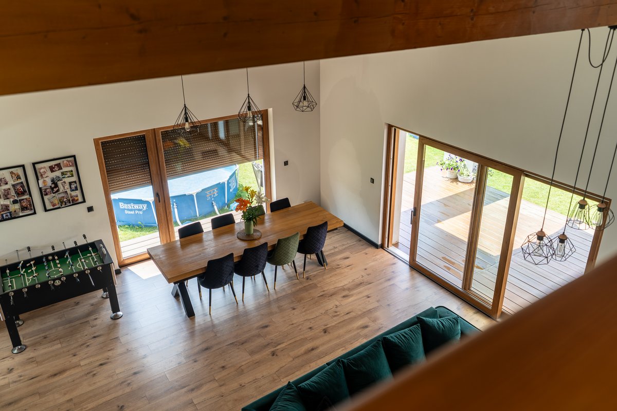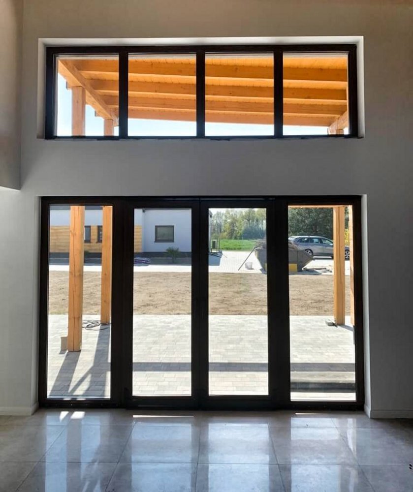Montaż okien. Drzwi tarasowe Drutex w systemie PSK ( uchylno-przesuwne) 2-skrzydłowe z poziomą przewiązką kolor: antracyt Roleta podtynkowa IT2000 Portos w kolorze antracyt. Podzielona na 2 części ( prowadnica umiejscowiona na środku drzwi tarasowych)