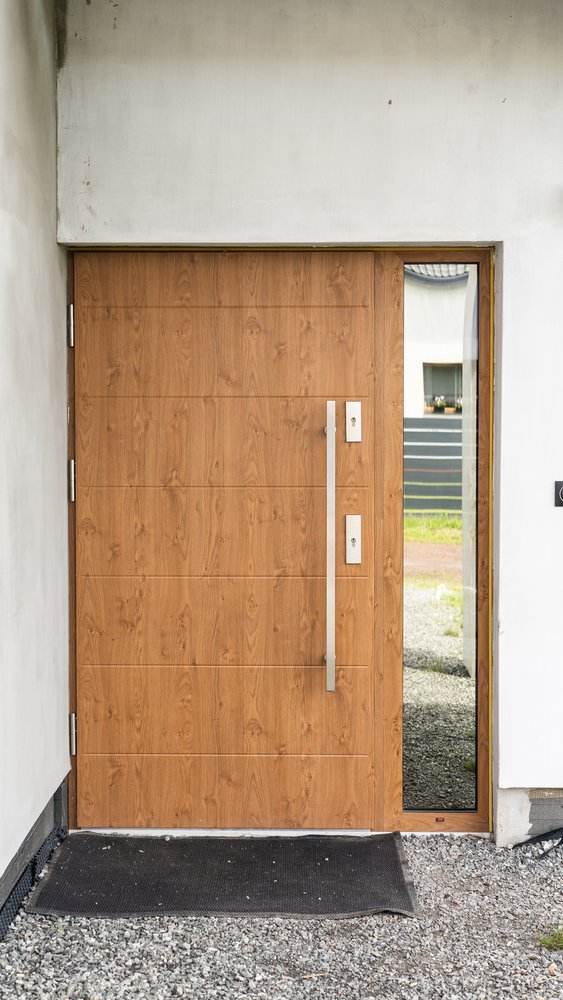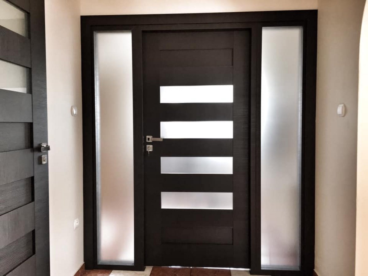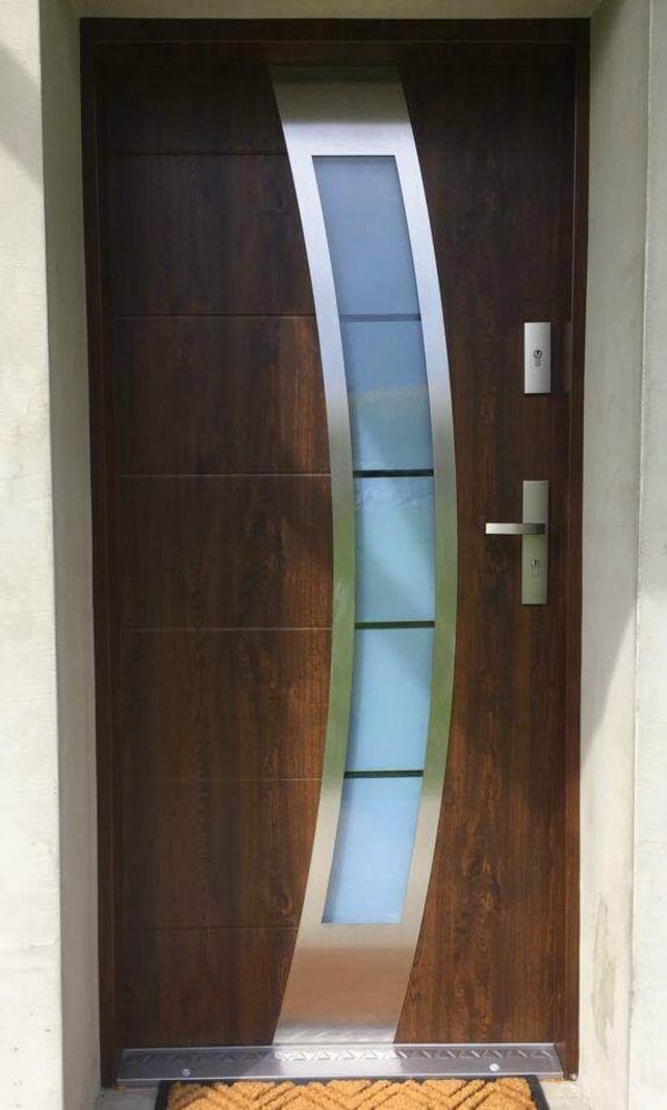 Montaż Drzwi Zewnętrznych. Drzwi zewnętrzne stalowe KMT model: 13s2 kolor: orzech szyba: mleczna z paskami dodatki: kolor inox klamka: Gama inox