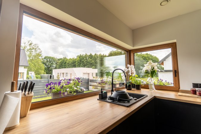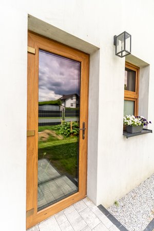 Montaż okien oraz drzwi zewnętrznych PVC. Montaż okien Drutex Profil: IGLO 5 Classic - okna, IGLO 5 - drzwi Kolor: orzech