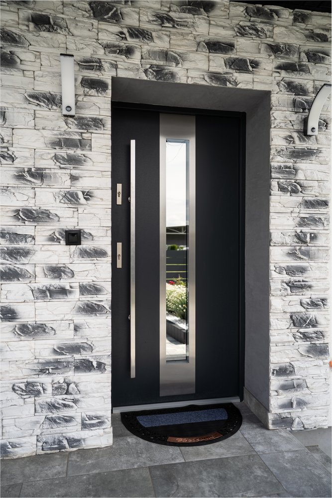 Montaż Drzwi Zewnętrznych. Drzwi zewnętrzne stalowe KMT, model: 11s3, kolor: antracyt z dodatkami w kolorze inox