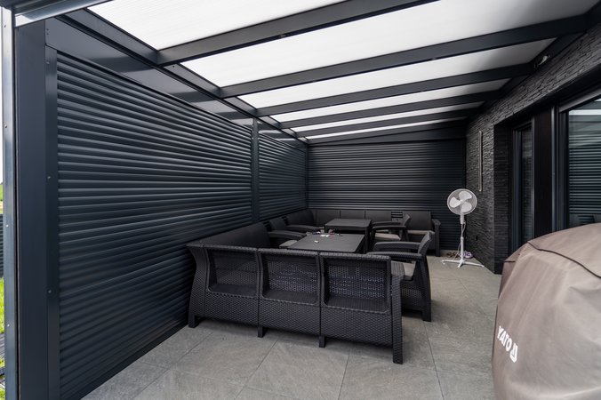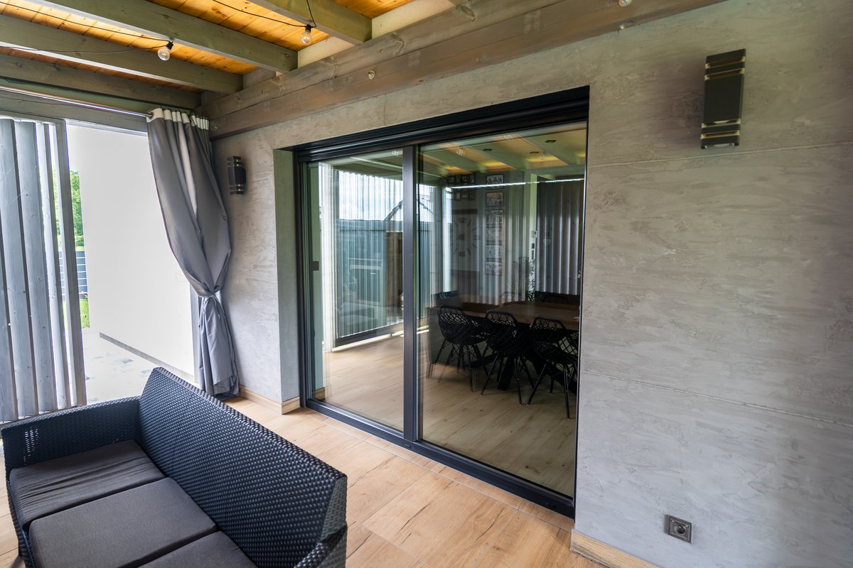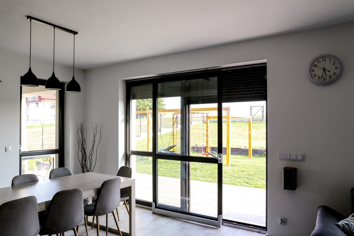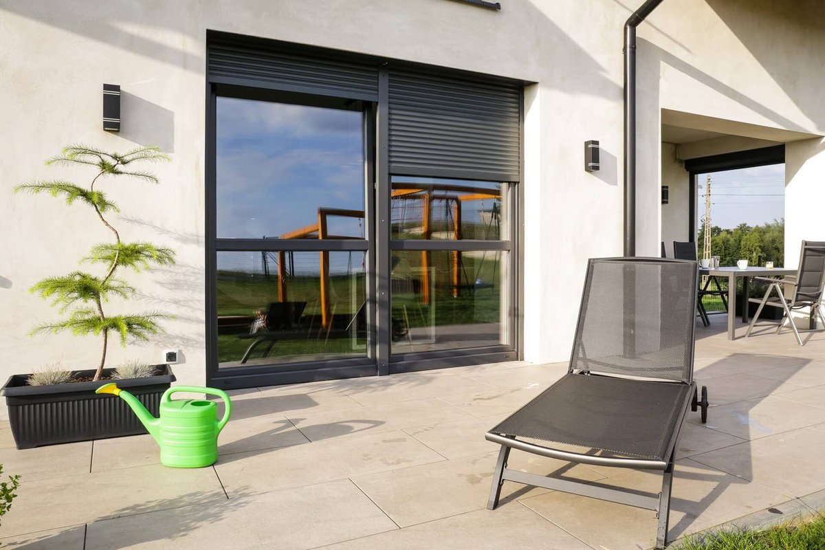 Montaż Okien PVC i Rolet Zewnętrznych. Drzwi tarasowe uchylno-przesuwne IGLO 5 Classic, okucie automatyczne, kolor: Antracyt, Rolety podtynkowe rozdzielone na kwatery