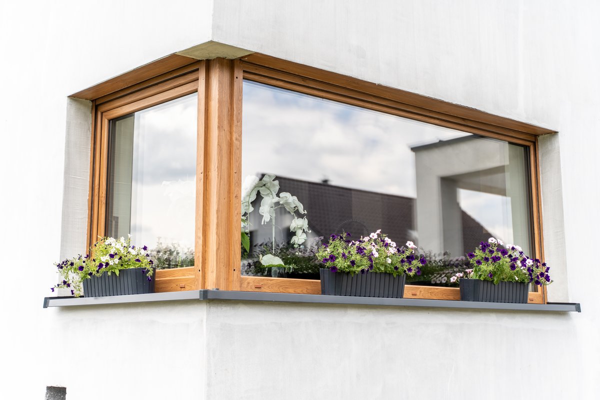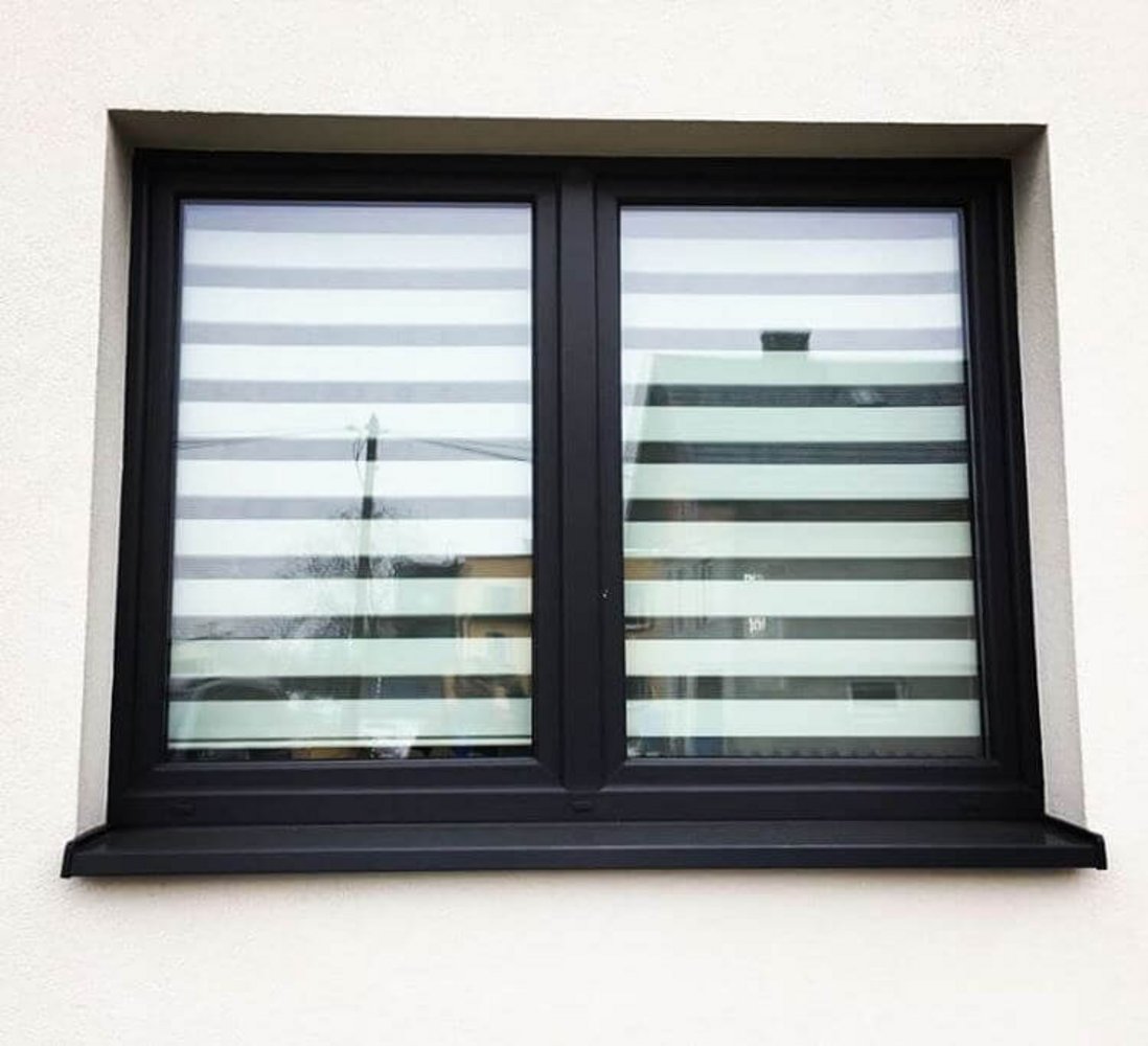 Montaż okien. Okno Drutex, profil: IGLO 5 Classic, 2-skrzydłowe, kolor: antracyt. Do tego parapet zewnętrzny ocynkowany RAL 7016 - antracyt oraz roleta wewnętrzna typu Dzień/Noc