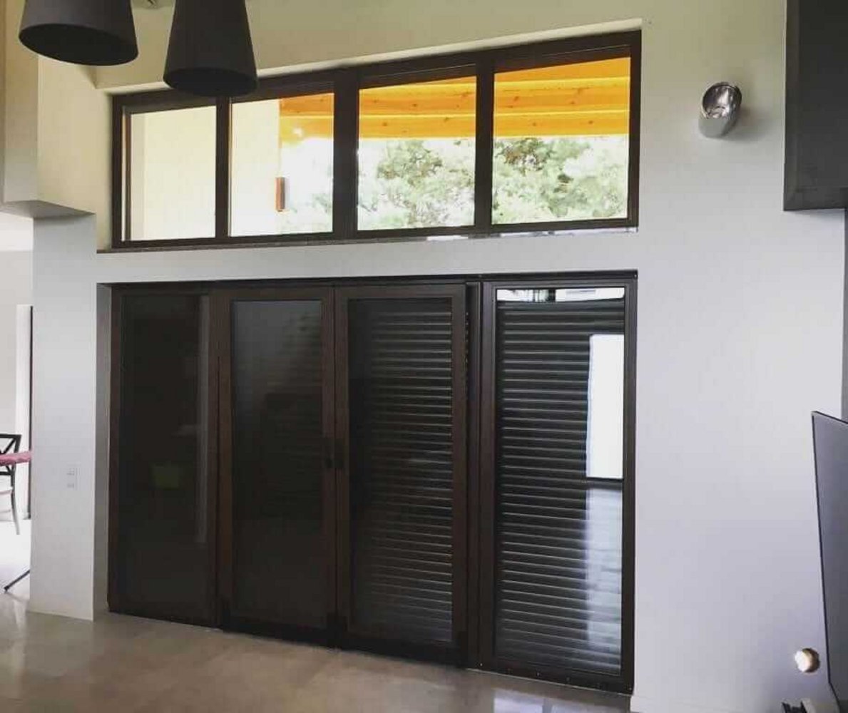 Montaż Okien. Okna Drutex, profil: IGLO 5 Classic kolor: obustronny orzech Po środku drzwi balkonowe, po bokach i u góry stałe szklenia typu fix