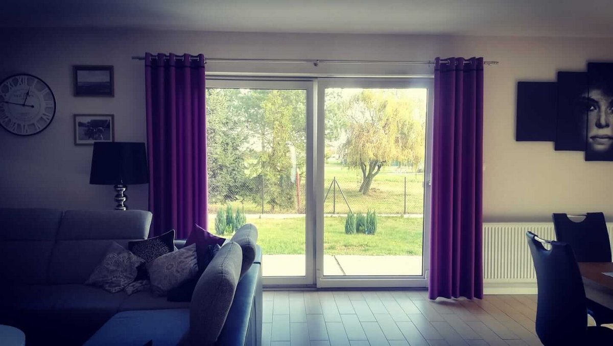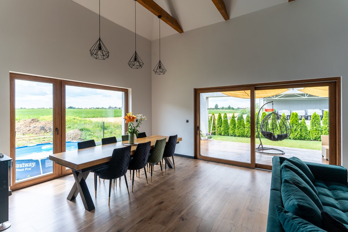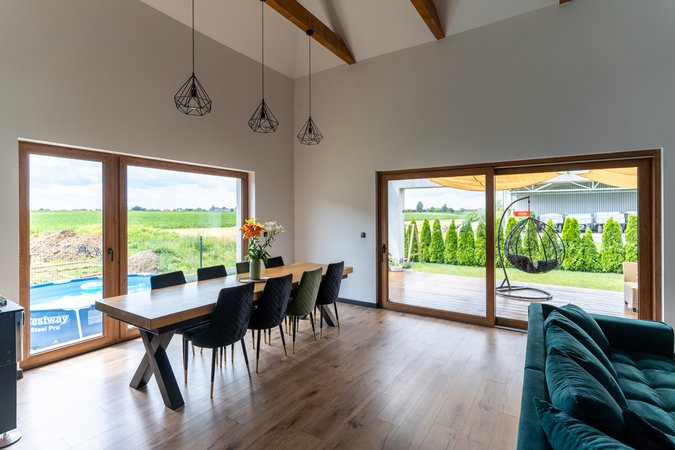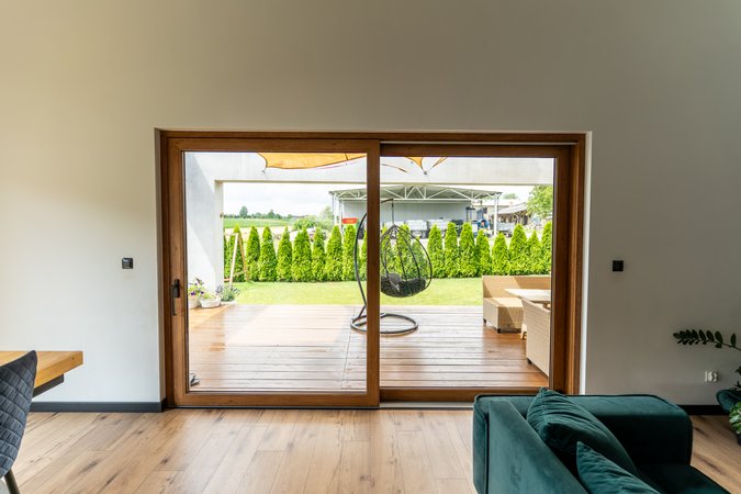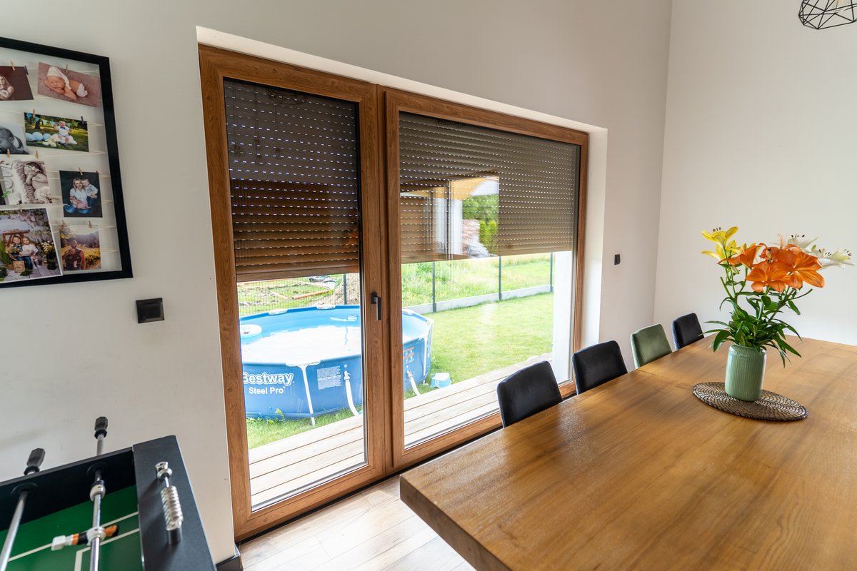 Montaż Okien. Okna Drutex, profil: IGLO 5 Classic, kolor: obustronny orzech. Na środku drzwi balkonowe 2-skrzydłowe z ruchomym słupkiem + po bokach i na górze stałe szklenia typu fix