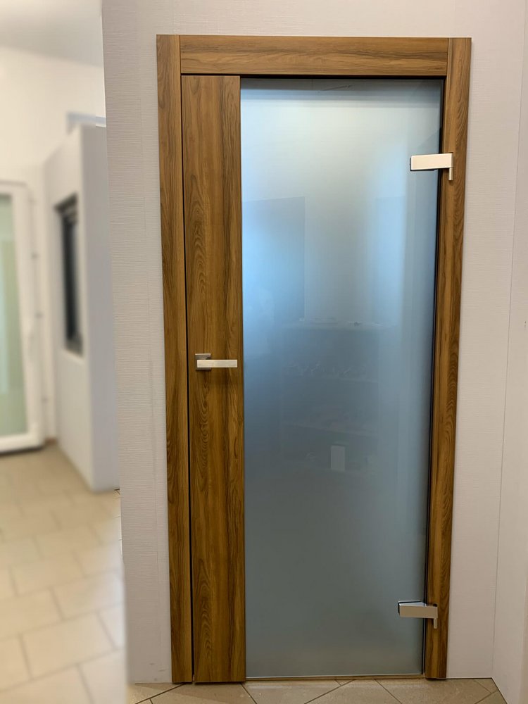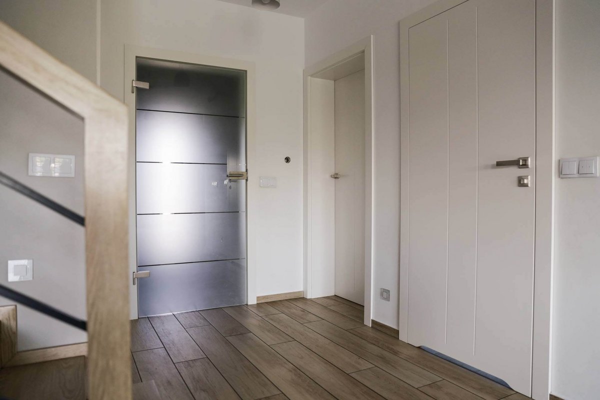 Montaż Drzwi Szklanych. Drzwi szklane Galla 2, szkło hartowane decormat, okucia stal nierdzewna, drzwi DRE Binito 30, lakier akrylowy biały, wersja bezprzylgowa