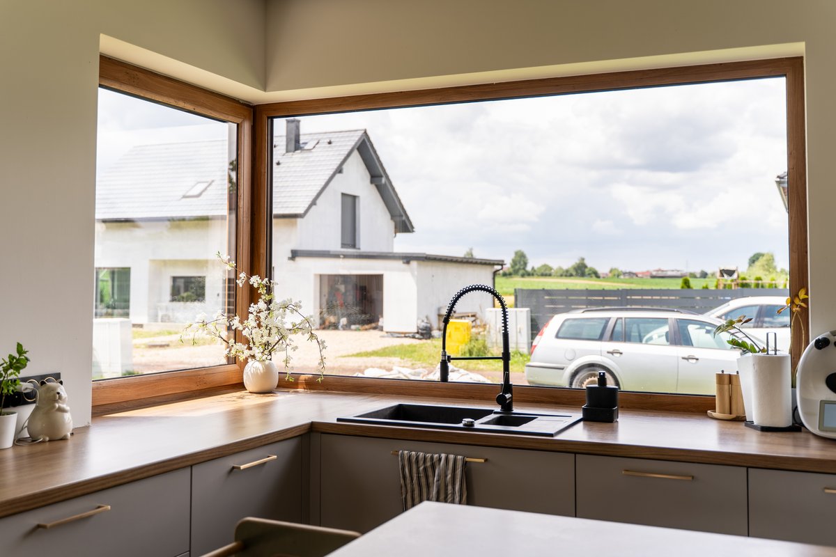 Montaż Okien. Okna Drutex, profil: IGLO 5 Classic, kolor: orzech. W wykuszu po prawej stronie drzwi balkonowe 1-skrzydłowe, na środku stałe szklenie fix 2-skrzydłowe