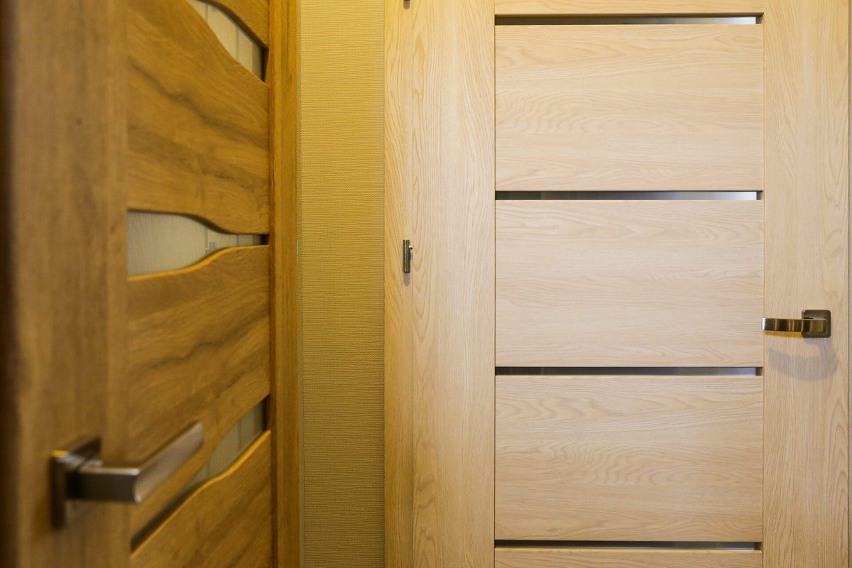 Po lewej: drzwi wewnętrzne DRE, model: EMENA w kolorze dąb vintage, Po prawej: drzwi wewnętrzne DRE, model: AURI w kolorze dąb grand